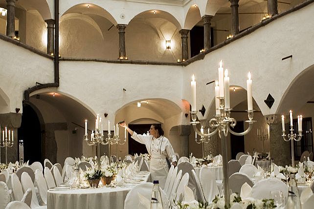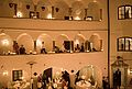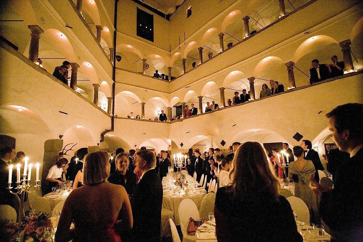 Der trapezförmige Innenhof ist einzigartig. Er ist der größte unregelmäßige Renaissance-Arkadenhof nördlich der Alpen. Mit über hundert Kerzen in den umlaufenden Arkadenbögen ist er besonders am Abend eine Augenweide für die Gäste und ein Garant für eine überwältigende feierliche Stimmung, die ihresgleichen sucht. Im Übrigen wird er bei zweifelhafter Witterung überdacht und beheizt.