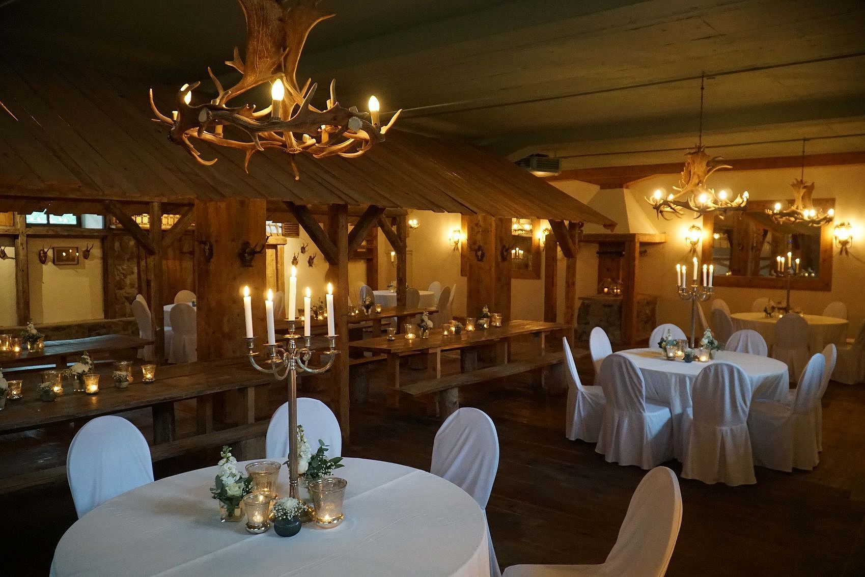 Ein herrschaftlicher und britisch anmutender Saal im 2. Stock. Optisch ganz dem Thema Jagd gewidmet, ausgestattet mit Jagdtrophäen der 800 ha großen Eigenjagd von Schloss Amerang. Er eignet sich hervorragend für Geburtstagsfeiern, eine Firmenpräsentation oder Schulung im privaten exklusiven Rahmen. Fragen Sie nach unserem speziellen Kombinationsangebot für Veranstaltungen ab 20 Personen inklusive Dreigänge-Menü.