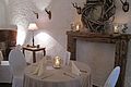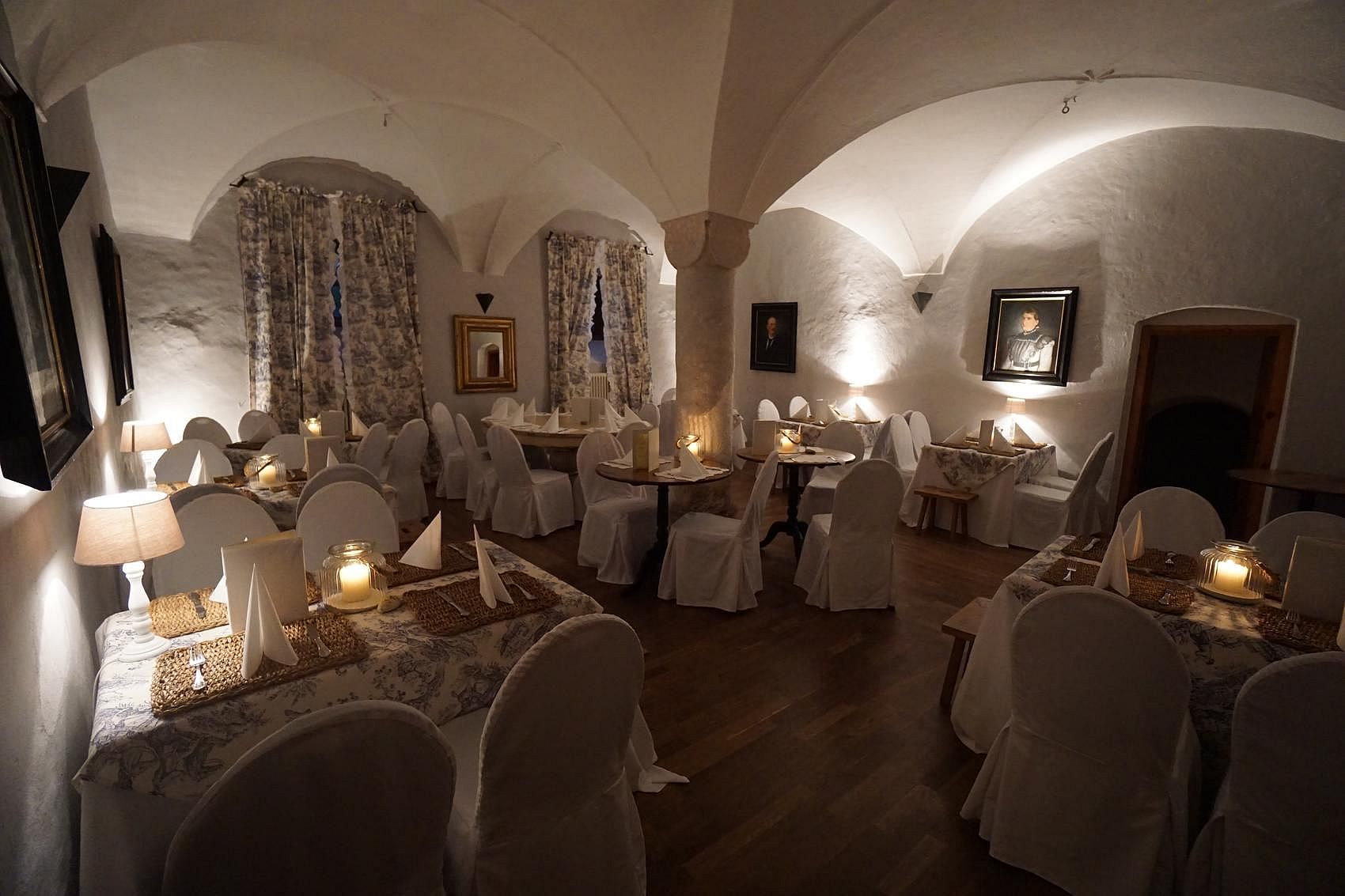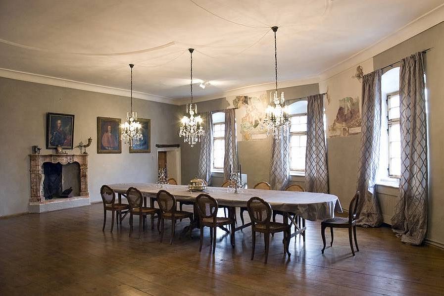 Der Rittersaal im 2 Stock, angrenzend an die privaten Räume der Freiherrn von Crailsheim, ist ein imposanter Raum mit ca 180 qm, gerade frisch renoviert, mit kostbaren Seidenvorhängen aus Florenz und imposanten alten Gemälden. Er kann für Stehempfänge bis ca 70 Personen, Lesungen, Kaminabende, und Degustationen gebucht werden.